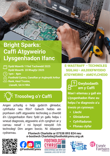 Galwch heibio ein prynhawn caffi atgyweirio technoleg a chwrdd â’n Llysgenhadon Ifanc fydd yn gallu helpu i wneud diagnosis, atgyweirio a’ch cynghori ar y camau nesaf i roi bywyd newydd i’ch technoleg!