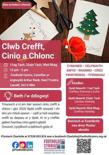 Bydd crefft newydd i chi drio ym mhob sesiwn – caiff yr holl nwyddau crefft eu darparu ar y dydd. Ar ol y crefftio gallwn fwynhau cinio gyda’n gilydd.