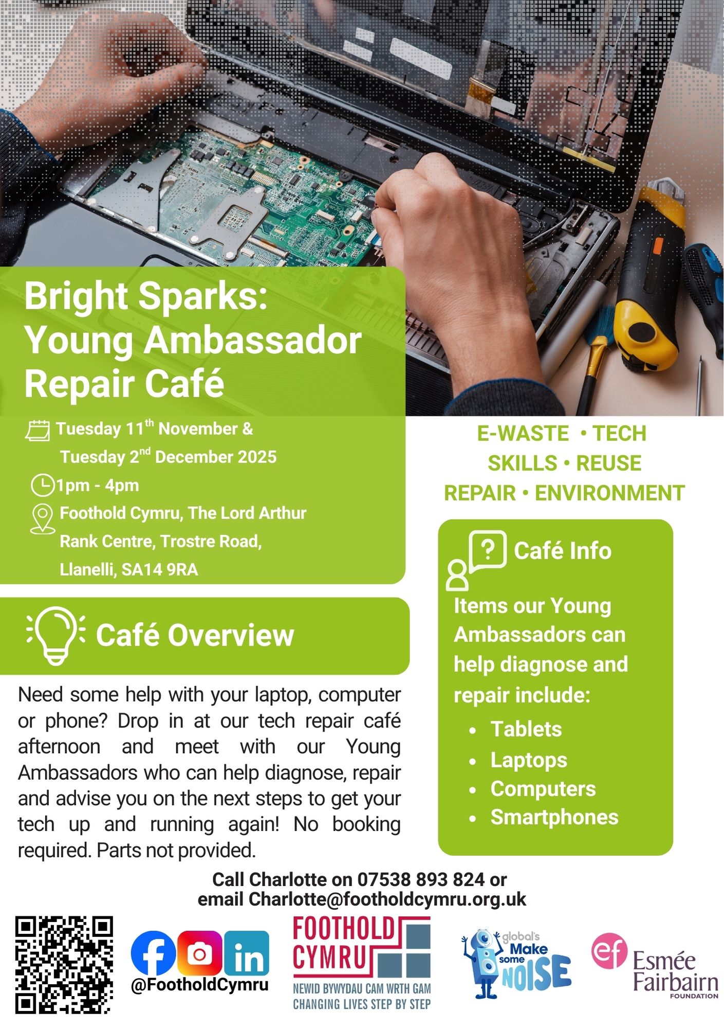 Drop in at our tech repair cafe afternoon and meet with our Young Ambassadors who can help diagnose, repair and advise you on the next steps to get your tech up and running again!